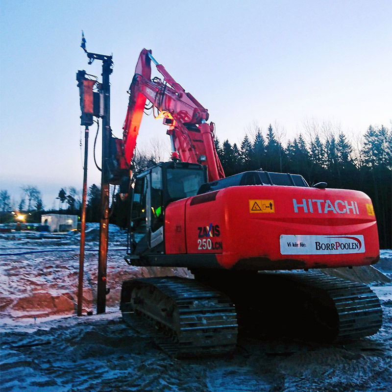 Vi utför även topphammarborrade pålar om det behövs. Även här har storleken ingen betydelse, då vi har topphammare från källarmus till 12m-rigg.